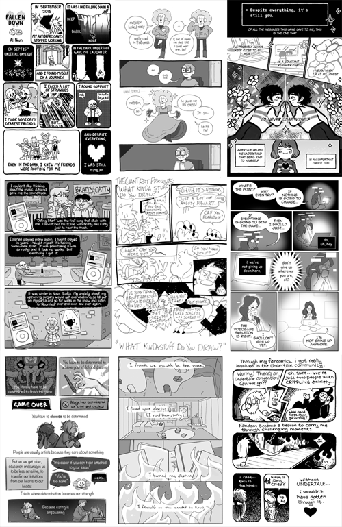 Made to celebrate the four year anniversary of the indie game UNDERTALE, Despite Everything is a 24 page zine black & white zine featuring nine comics by nine stellar contributors talking about their feelings and reflections on how Undertale impacted them and influenced their lives.